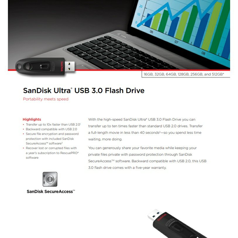 Fast USB 3.0 performance – Secure and reliable portable storage with USB 3.0 performance and high capacities make it ideal for all your photos, videos, music, and other files. The included SanDisk SecureAccess™ software1 provides password-protection to keep private files secure while leaving the rest of the drive available for sharing, while the retractable design safeguards the USB 3.0 connector when the drive is not in use.