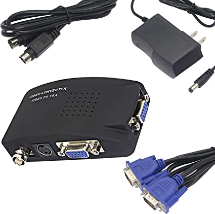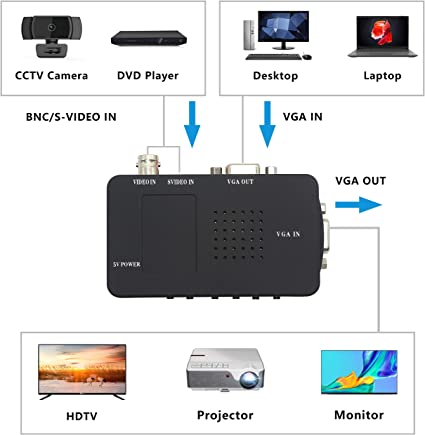 BNC to vga converter: It has VGA, S-video and BNC input and VGA output, by which it can convert S/Video interlaced signals of DVD/DVR, CCTV Camera or other devices into VGA signal and display on PC monitor or LCD.This conventor is with the different 2 VGA interfaces, pls select the corrent the VGA interface as inout or output interface .Like when you connect BNC as the input signal soure to VGA montor , then you need connect VGA OUT interface,doesn’t connect the VGA IN interface .